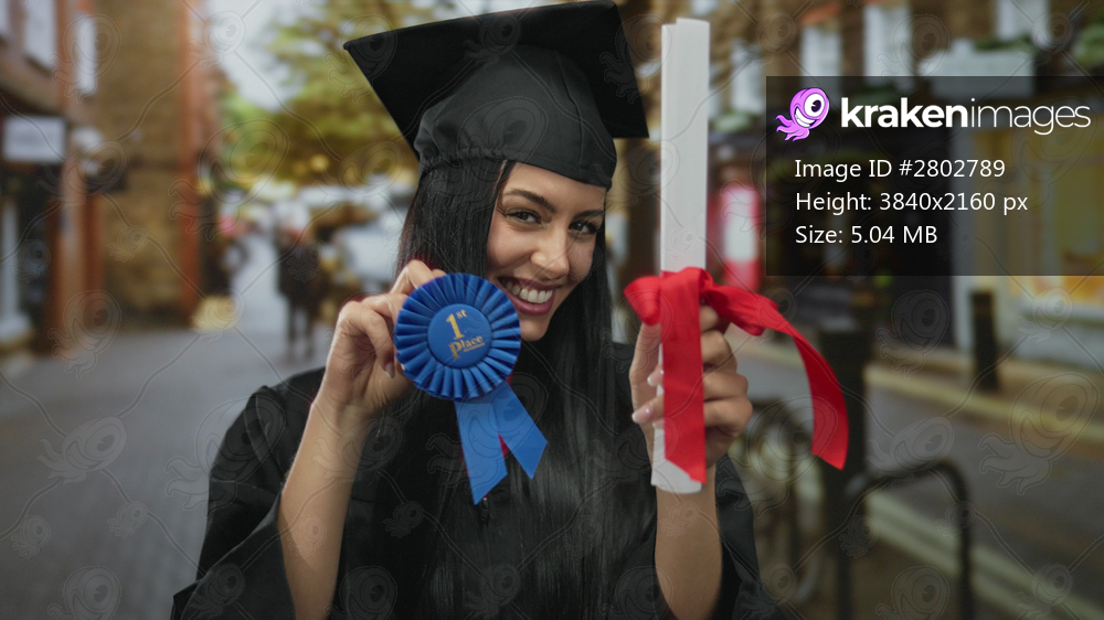Young hispanic woman in graduation cap and gown proudly holds diploma and blue ribbon while standing on urban street.