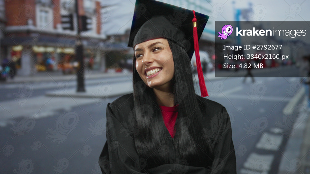 Young hispanic woman in graduation cap stands smiling on an urban street, celebrating her achievement in an outdoor city environment.