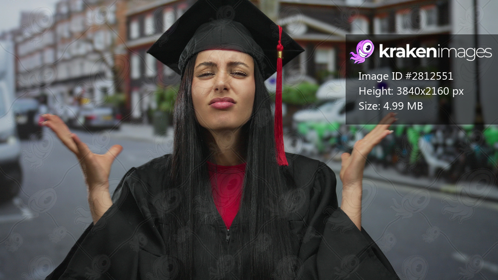 Young hispanic woman in graduation gown looking frustrated on a city street, expressing emotion outdoors with hands raised and eyes closed.