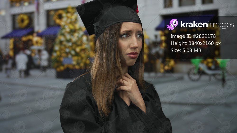 Young hispanic woman in graduation gown and mortarboard clasping hands on chest in city street; future hope.