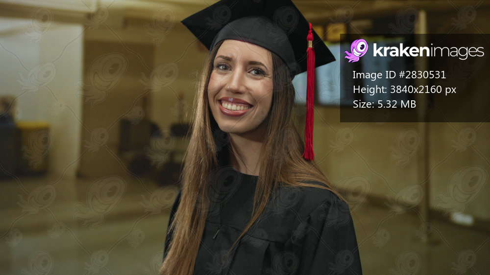 Young hispanic woman in graduation gown smiles inside airport terminal; pride accomplishment milestone.