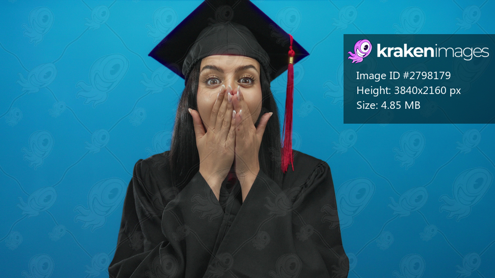 Young hispanic woman in graduation uniform covering her mouth in surprise over an isolated blue background wall celebrating her achievement.