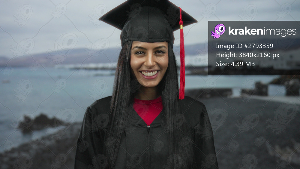 Young hispanic woman in graduation uniform gestures silence on seaside promenade with sea and beach in background, representing education and cultural celebration outdoors. - Kraken Images