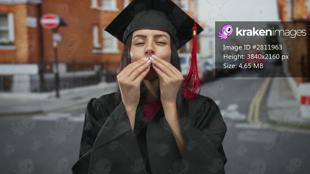 Young hispanic woman in graduation uniform joyfully celebrating on a city street with red brick buildings in the background, expressing excitement and achievement. - Kraken Images