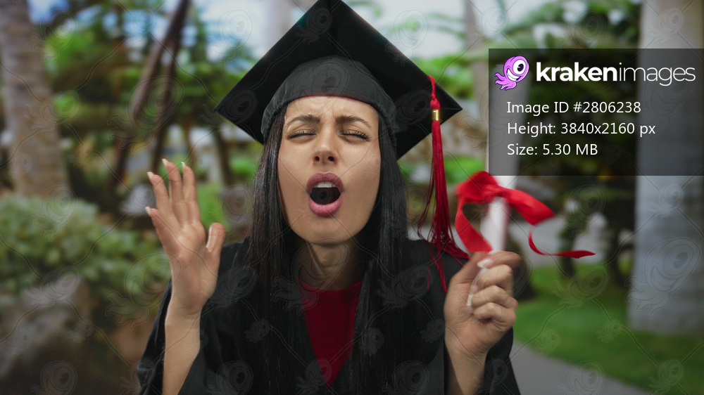 Young hispanic woman in graduation uniform outdoors holding diploma and expressing emotions in a lush green park setting