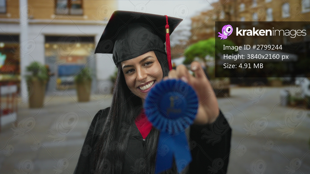 Young hispanic woman in graduation uniform outdoors in city street, holding award ribbon and celebrating her academic success with a joyful expression. - Kraken Images