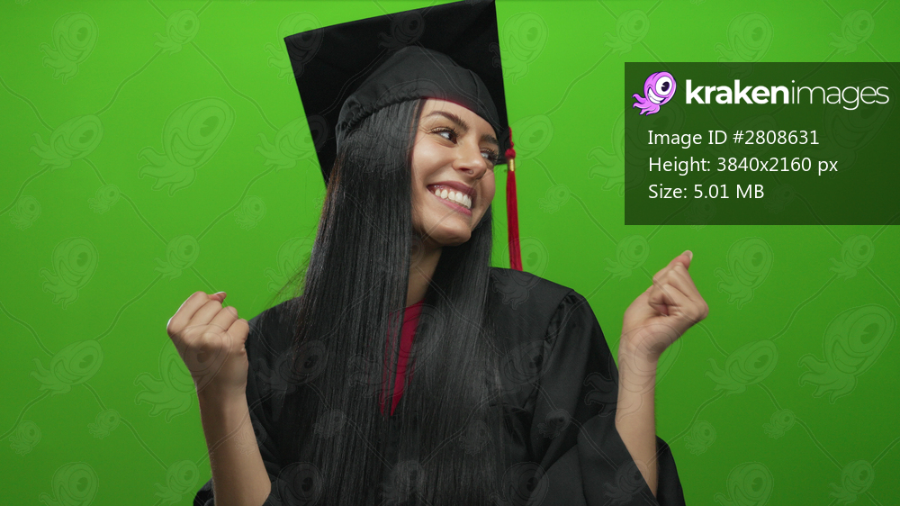Young hispanic woman in graduation uniform smiling joyfully against isolated green background adjusting cap confidently signaling achievement and pride in her accomplishment - Kraken Images
