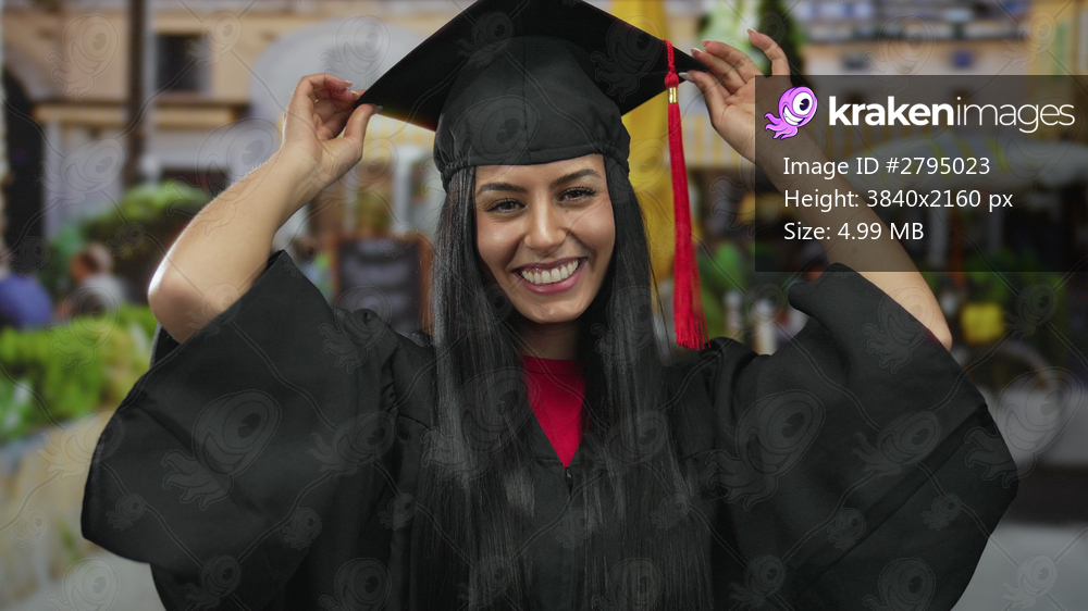 Young hispanic woman in graduation uniform smiling outdoors in vibrant city street setting celebrating achievement