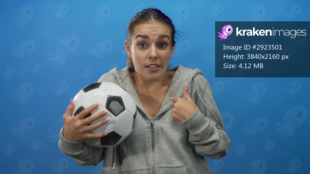 Young hispanic woman in gray hoodie holding a soccer ball and pointing finger to chest in blue studio; confusion doubt.