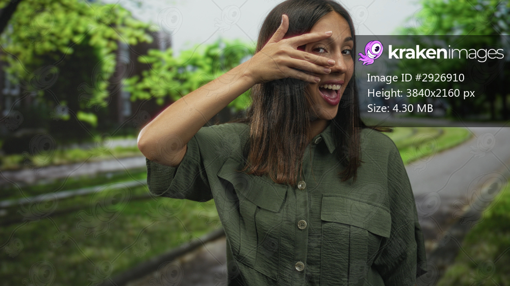Young hispanic woman in green shirt covers eye with hand in park on a tree lined path; playful curiosity.