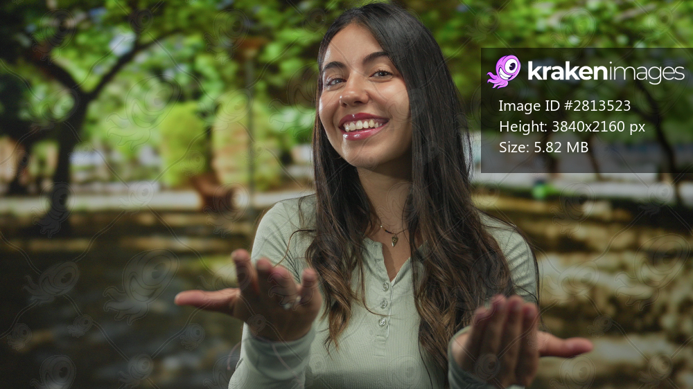 Young hispanic woman in green shirt smiles and beckons with hands on a sunlit forest path; invitation.