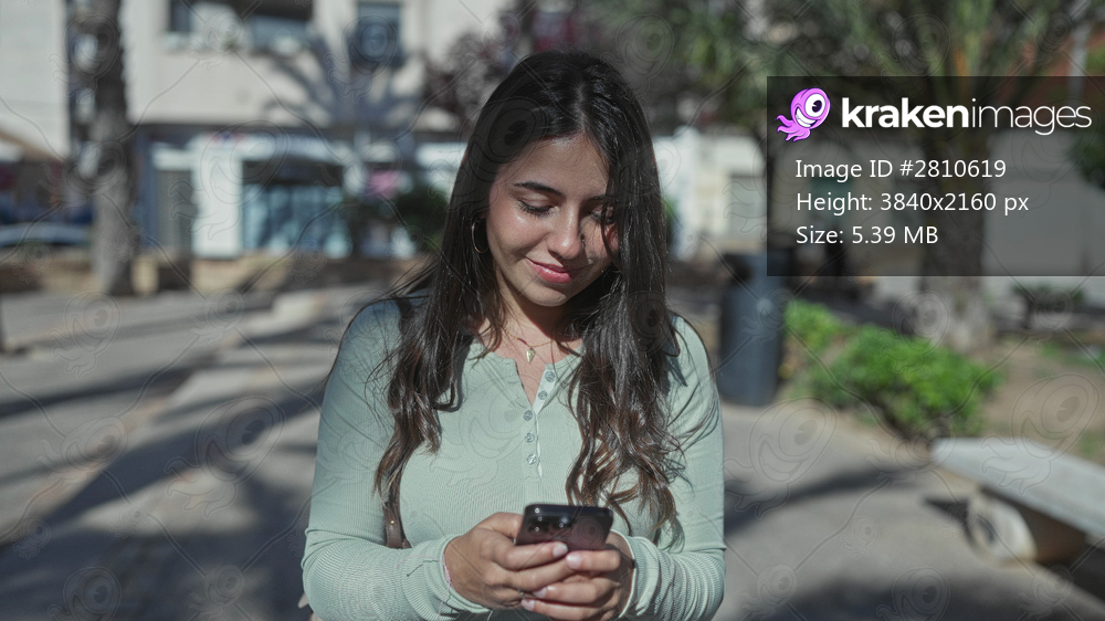Young hispanic woman in green shirt using smartphone outdoors on a sunny urban street showing a serene and focused expression amidst a vibrant environment - Kraken Images