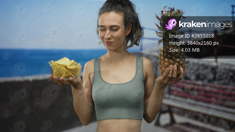 Young hispanic woman in green sports bra balances a pineapple and a bowl of chips in street; temptation.