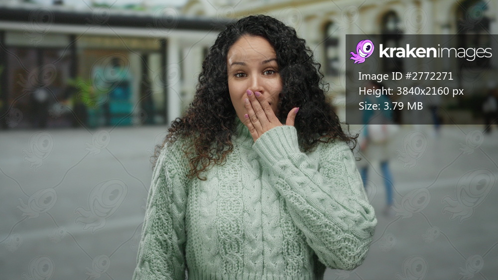 Young hispanic woman in green sweater outdoors on bustling street, expressing surprise with hand over mouth, city background adds urban context and modern feel. - Kraken Images