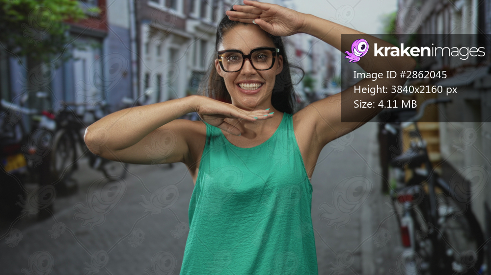 Young hispanic woman in green tank top wearing glasses frames face with raised arms on city street; happiness.