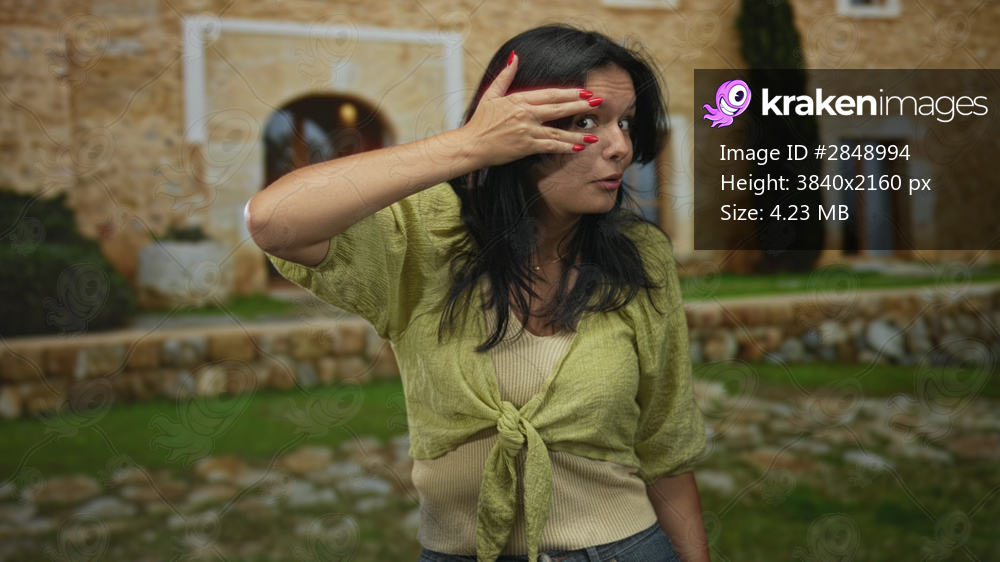 Young hispanic woman in green top covers eye with hand against rustic stone building facade; mystery.