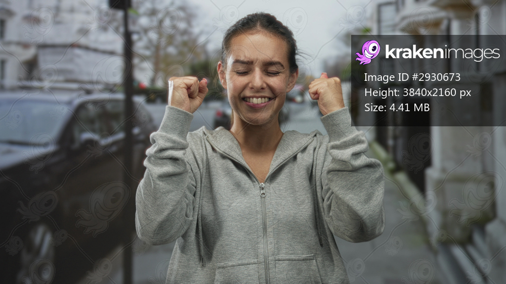 Young hispanic woman in grey hoodie clenches fists and smiles on a city street lined with parked cars and townhouses; personal victory joy.