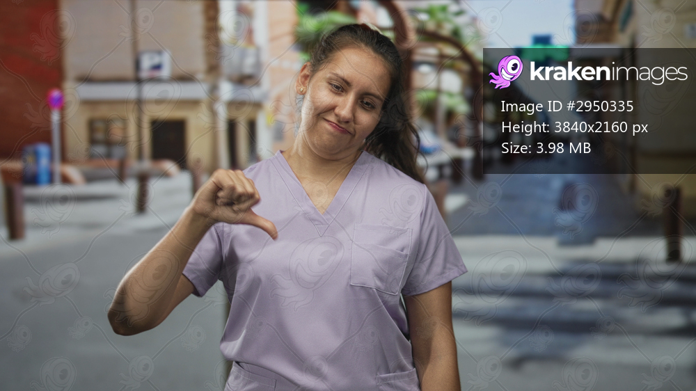 Young hispanic woman in lavender medical scrubs showing thumbs down gesture on a busy city street with storefronts and awnings; disapproval doubt.