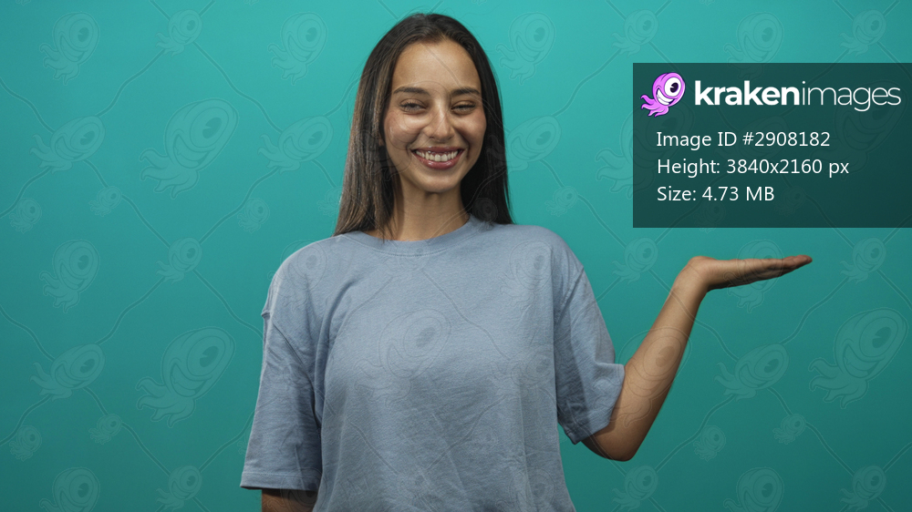 Young hispanic woman in light blue t shirt holding open palm and smiling with eyes closed against teal studio wall; joyful.