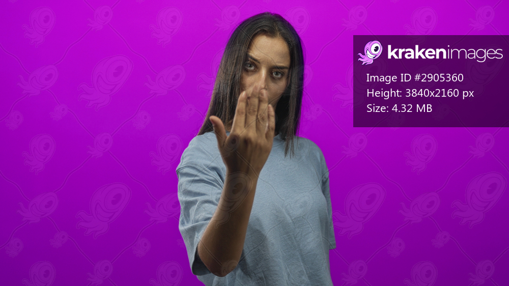 Young hispanic woman in light blue t shirt points finger forward with outstretched hand toward camera in purple studio; defiance strength.