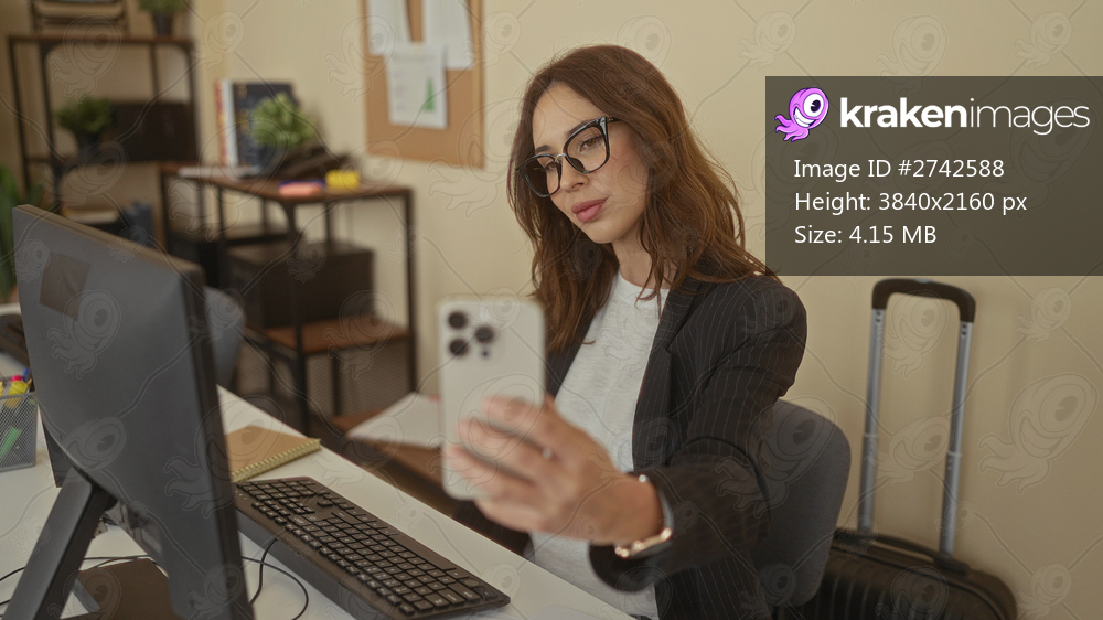 Young hispanic woman in office taking selfie with smartphone while sitting at desk with computer and luggage in background showcasing modern workplace interior - Kraken Images