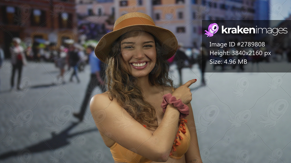 Young hispanic woman in orange bikini smiling and pointing finger to side on crowded street; summer fun happiness excitement.