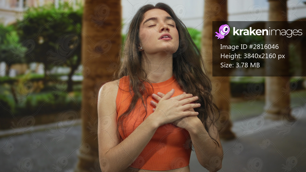 Young hispanic woman in orange sleeveless top clutching chest in building courtyard with arches and columns at sunset; pain.