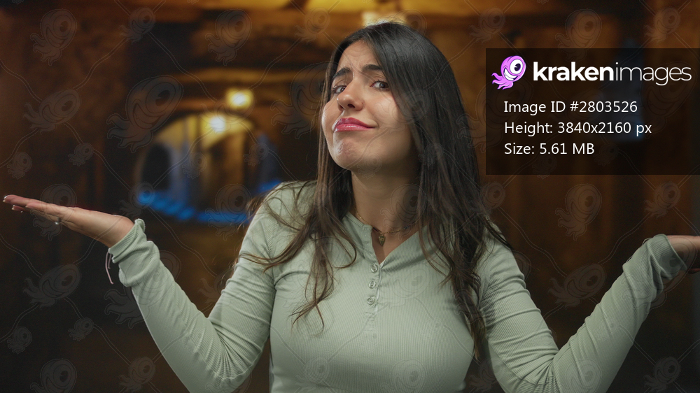 Young hispanic woman in outdoor alleyway, expressing confusion with arms raised, wearing casual clothes, under warm lighting in an urban environment.