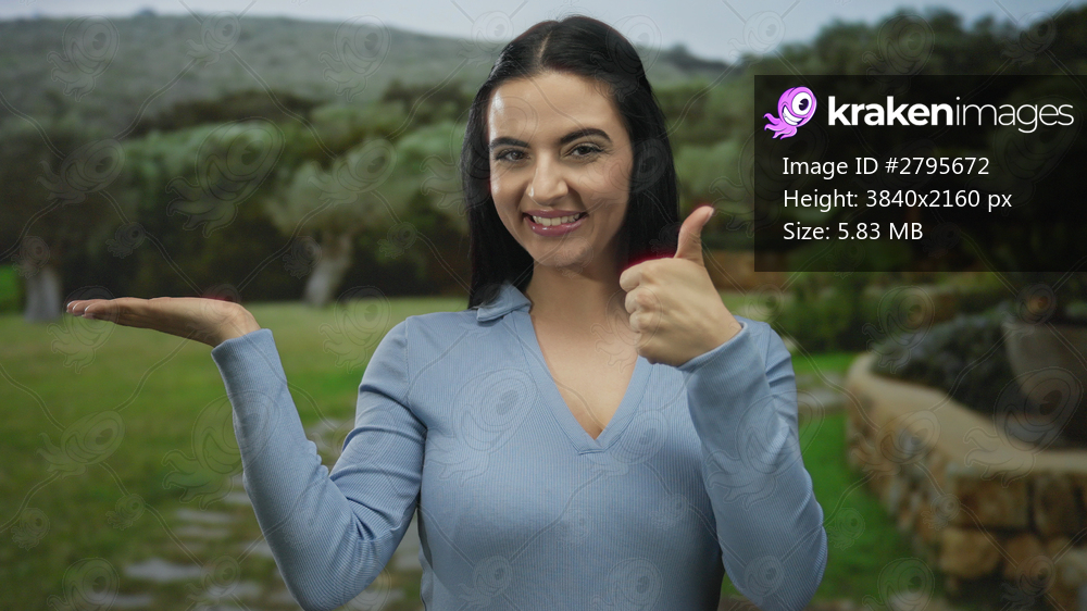 Young hispanic woman in park gestures with thumb up and smiles creating a positive outdoor vibe against a lush green backdrop
