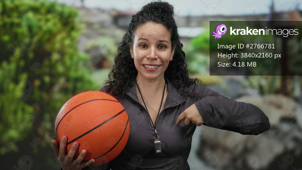 Young hispanic woman in park holding basketball and wearing whistle in casual outfit pointing at herself with trees in background outdoors