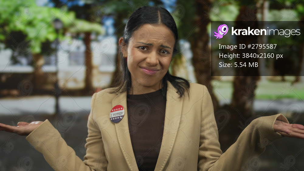 Young hispanic woman in park wearing i voted badge with american flag in background outdoors looking proud and confident after participating in democratic process - Kraken Images