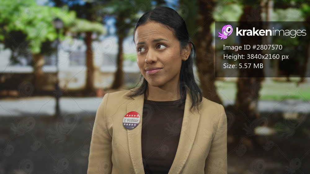 Young hispanic woman in park wearing i voted badge with american flag in background outdoors looking proud and confident after participating in democratic process - Kraken Images