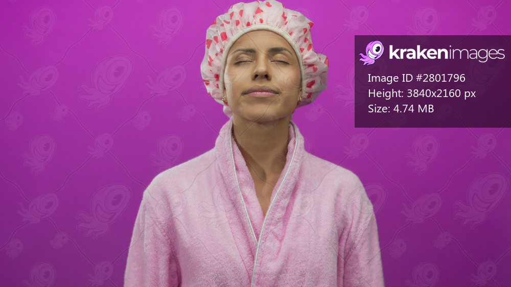 Young hispanic woman in pink bathrobe meditates with closed eyes against isolated vibrant pink background.