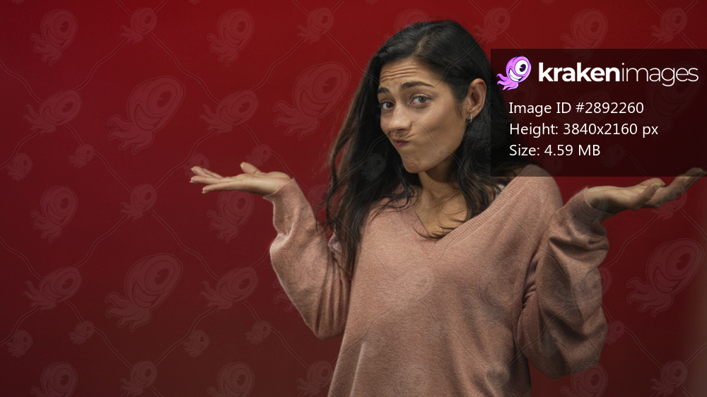 Young hispanic woman in pink sweater shrugging with palms up and pursed lips in red studio; uncertainty.