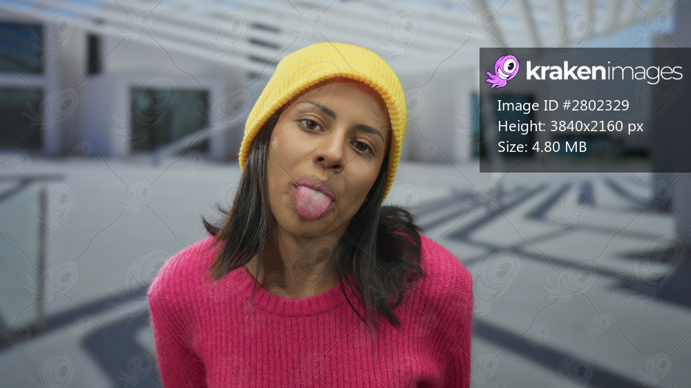 Young hispanic woman in pink sweater and yellow beanie outdoors displaying playful expression in urban setting with shadows and modern architecture