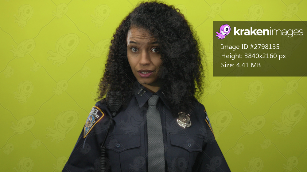 Young hispanic woman in police uniform gesturing confidently against a vibrant yellow isolated background.