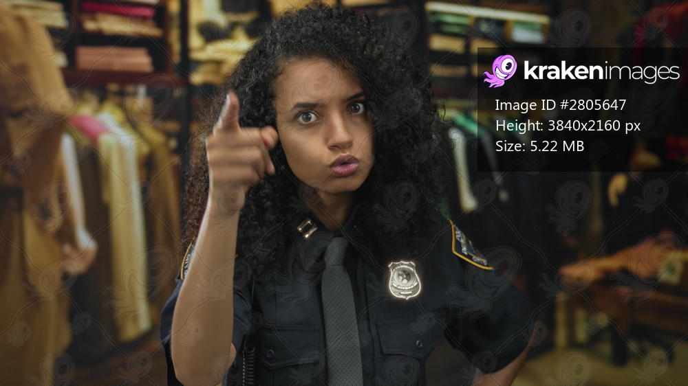 Young hispanic woman in police uniform stands in a retail clothing store, looking determined and focused indoors, showcasing professional authority within a shopping environment. - Kraken Images