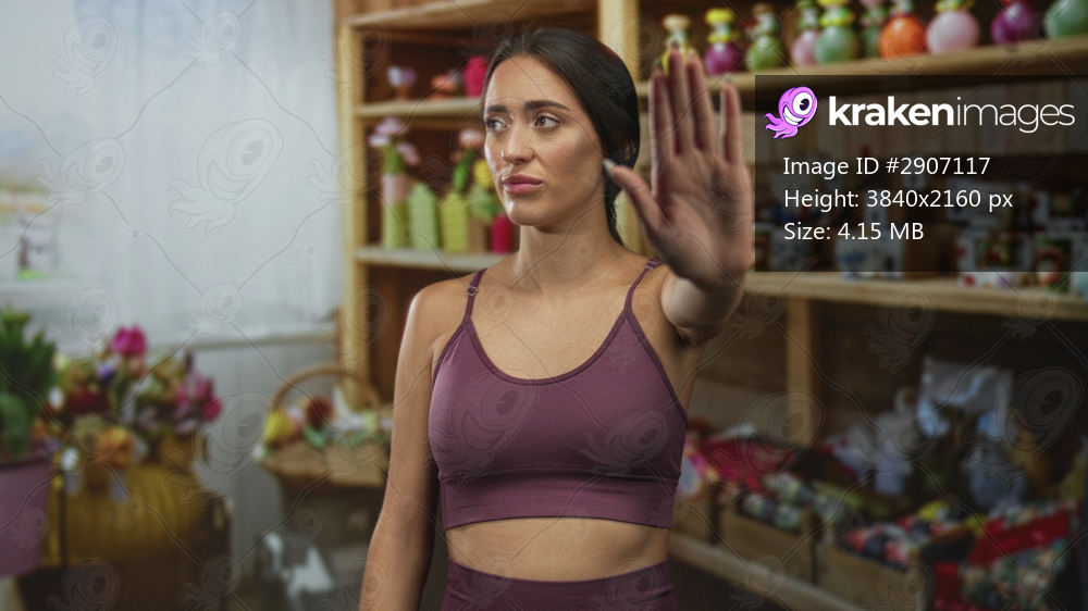Young hispanic woman in purple sports bra with hand raised palm out toward camera beside flower display in building; rejection.