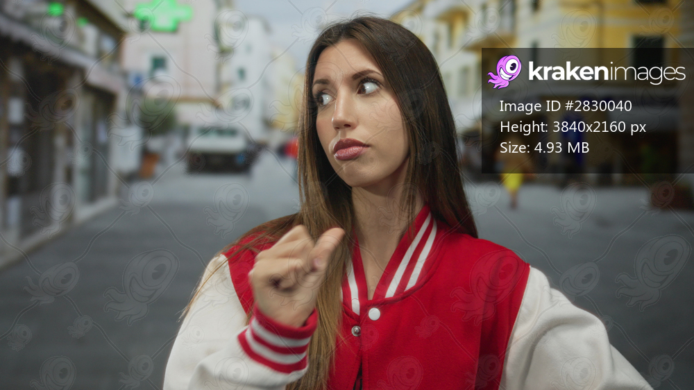 Young hispanic woman in red cheerleader uniform jacket with fist to chest on city street; confidence empowerment.