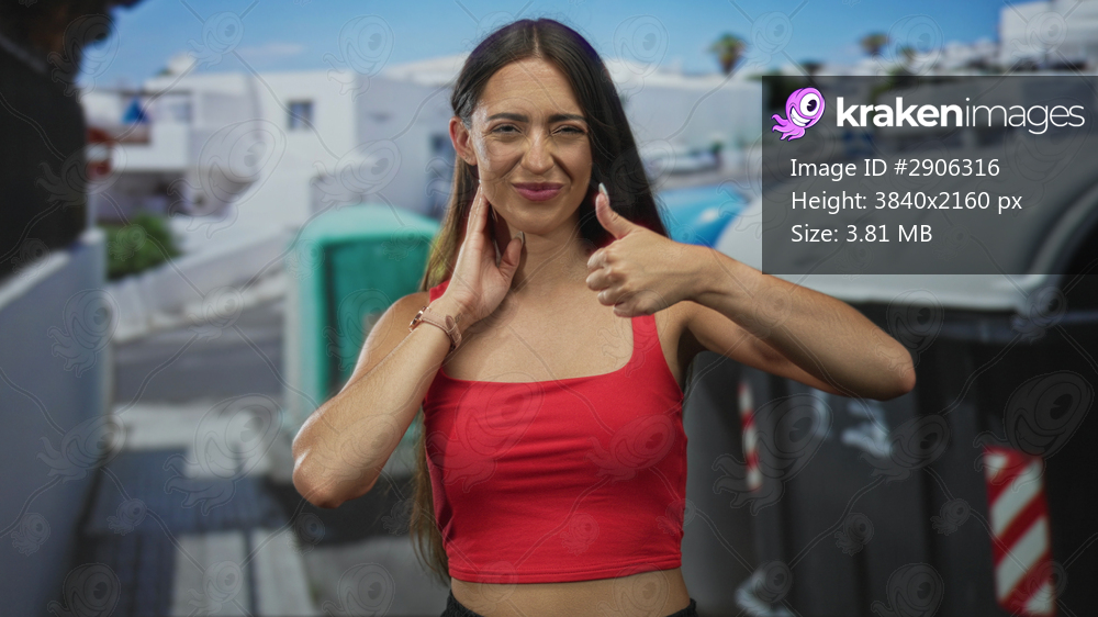 Young hispanic woman in red crop top giving thumbs up and touching neck beside recycling container on sunny street; optimism recycling awareness community. - Kraken Images