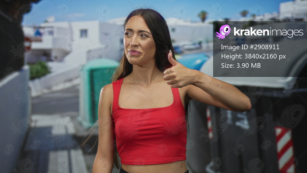 Young hispanic woman in red crop top giving thumbs up and touching neck beside recycling container on sunny street; optimism recycling awareness community. - Kraken Images