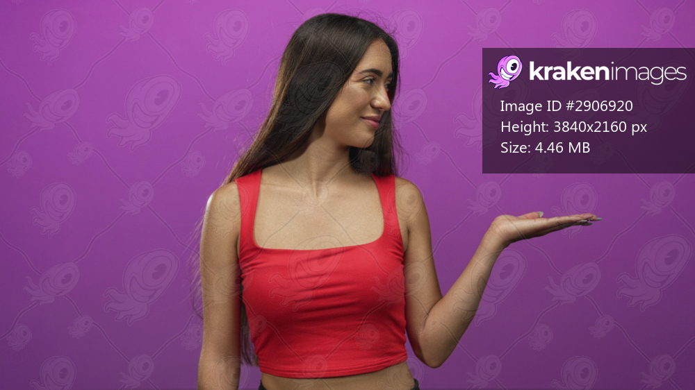 Young hispanic woman in red crop top presenting palm up with exposed shoulder in purple studio setting and smiling; confidence welcome.