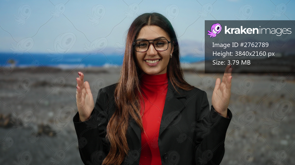 Young hispanic woman in red shirt and black jacket gesturing with hands on a beach with ocean backdrop showcasing a confident outdoor vibe
