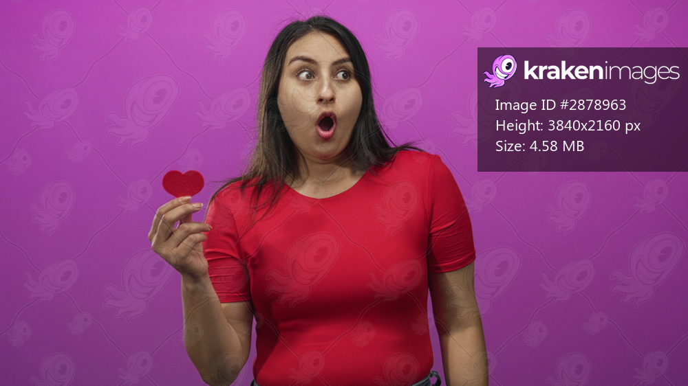 Young hispanic woman in red shirt holding small red heart and pointing index finger in magenta studio; surprise love affection.