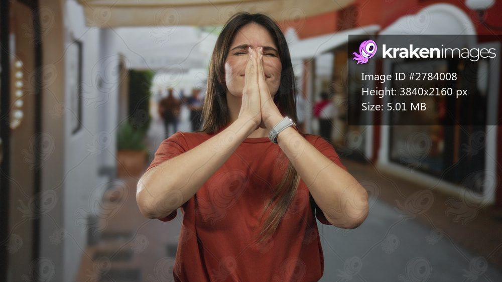 Young hispanic woman in red shirt prays with eyes closed on a bustling city street filled with shops and people, exuding hope and peace in a vibrant urban setting. - Kraken Images