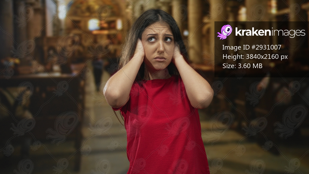Young hispanic woman in red shirt pressing hands to ears with pained expression inside church building aisle; spiritual anxiety.