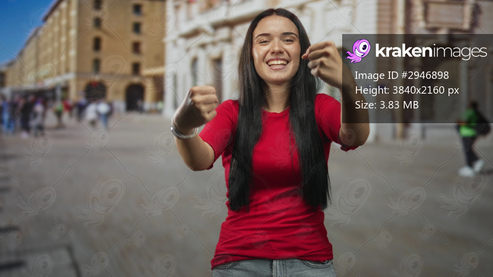 Young hispanic woman in red shirt pushing fists forward in a crowded street plaza, making a playful beckoning gesture toward the camera; playful challenge. - Kraken Images