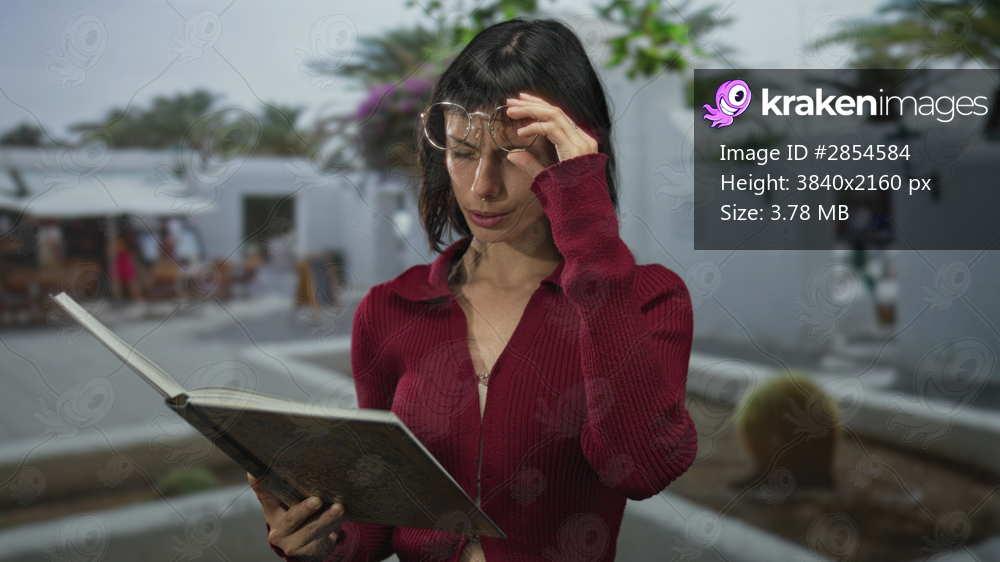 Young hispanic woman in red sweater holding book adjusts glasses on street; quiet contemplation of knowledge.
