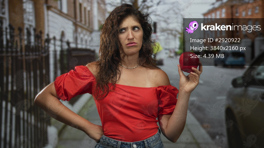 Young hispanic woman in red top holds apple with exposed shoulder and hand on hip on street; skepticism.
