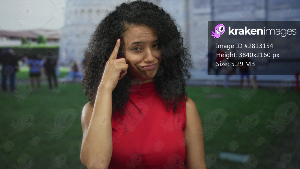 Young hispanic woman in red top points finger to head near pisa tower building on green lawn; thinking idea thought pondering.